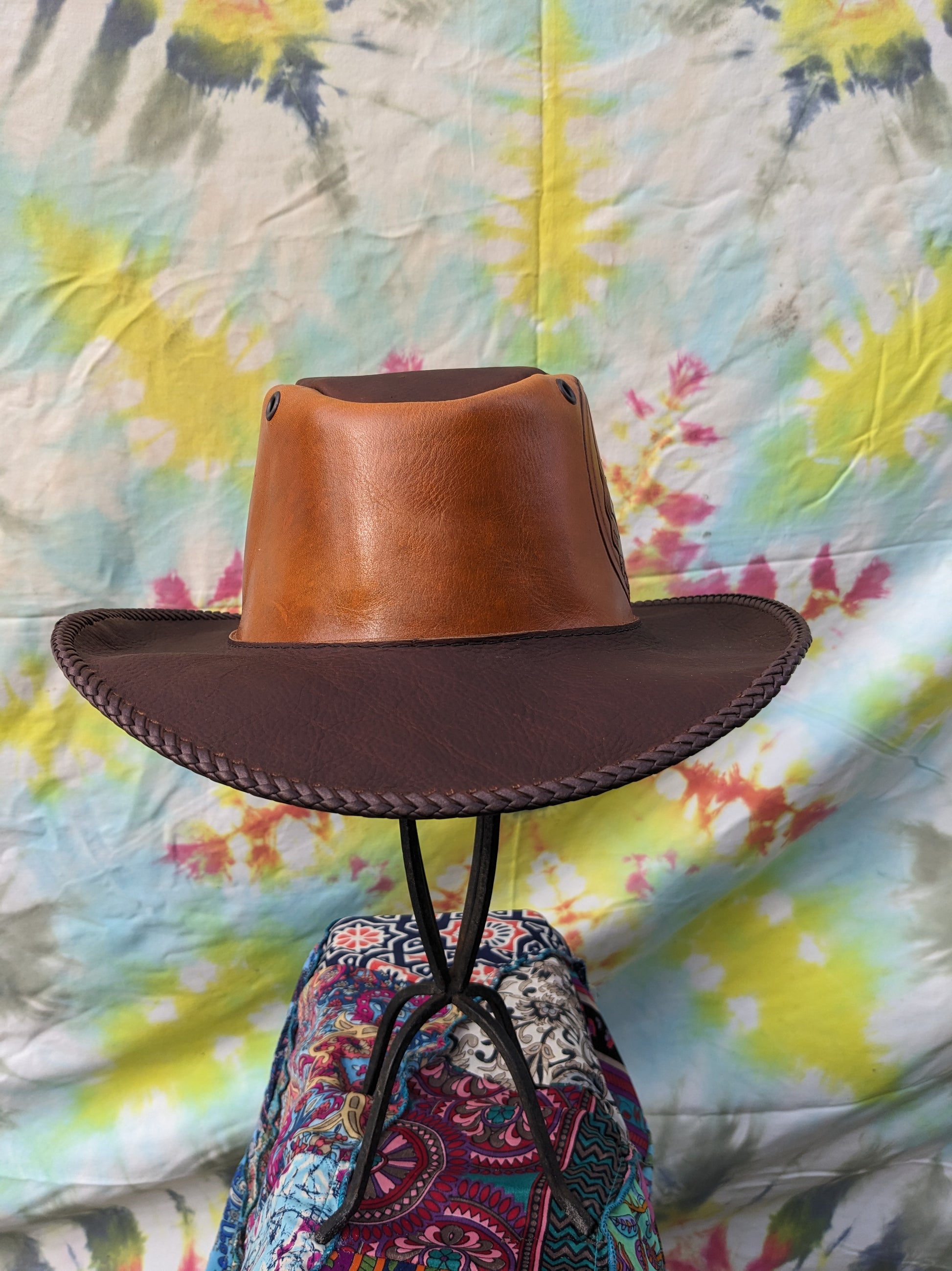 This hat is made of genuine leather with inspiration from the band Grateful Dead. Hand tooled image on side of the crown (what side of hat may vary), hand dyed and then assembled with care. Someone wearing this hat is sure to get many compliments everywhere they go. Sizes S, M, L, XL